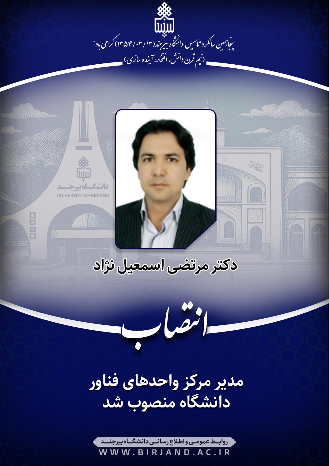 به گزارش روابط عمومی و اطلاعرسانی دانشگاه بیرجند، در این ابلاغ انتصاب آمده است؛ نظر به مراتب تعهد، تجارب و شایستگیهای علمی و اجرایی جنابعالی و با تشکر از اقدامات و تلاشهای مستمر، مثمرثمر و ارزشمند شما و به پیشنهاد سرپرست معاونت محترم پژوهش، فناوری و نوآوری دانشگاه و موافقت پارک علم و فناوری خراسان جنوبی، به موجب این ابلاغ و با حفظ سمت آموزشی و پژوهشی به مدت دو سال به عنوان مدیر مرکز واحدهای فناور دانشگاه منصوب میشوید. اطمینال دارم با اتکال به خداوند سبحان و بهرهگیری از مشارکت و همفکری همکاران دانشگاهی، منشاء خدمات ارزندهای خواهید بود.