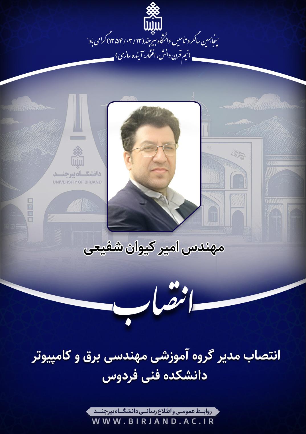 به گزارش روابط عمومی و اطلاع‌رسانی دانشگاه بیرجند، در ابلاغ صادره از سوی سرپرست دانشگاه آمده است؛ نظر به مراتب تعهد، تجارب و شایسـتگی‌های علمی و اجرایی جناب‌عالی به پیشنهاد رئیس محترم دانشکده فنی فردوس به موجب این ابلاغ و با حفظ سمت آموزشی و پژوهشی، به سمت مدیر گروه آموزشی  مهندسی برق و کامپیوتر دانشکده فنی فردوس  به مدت دو سال منصوب می‌شوید. انتظار دارد علاوه بر تـوجه به دسـتورالعمل‌هـای مربوط به گروه‌های معارف اسلامی و  شرح وظایف مدیران گروه‌های آموزشی مندرج در آئین‌نامه‌ها و دستورالعمل‌های وزارتی و داخلی دانشگاه، به آیین‌نامۀ جامع مدیریت دانشگاه‌ها و مؤسـسات آموزش عالی، پژوهشـی و فناوری، رئوس انتظارات دانشـگاه،( براساس شرح وظایف سازمانی، مصوبات هیآت نظارت، ارزیابی و تضمین کیفیت و سند چشم‌انداز) دستورالعمل میزان و نحوه حضور و  فعالیت اعضای هیأت علمی دانشگاه در طرح‌های تمام وقت عادی و ویژه توجه شود.