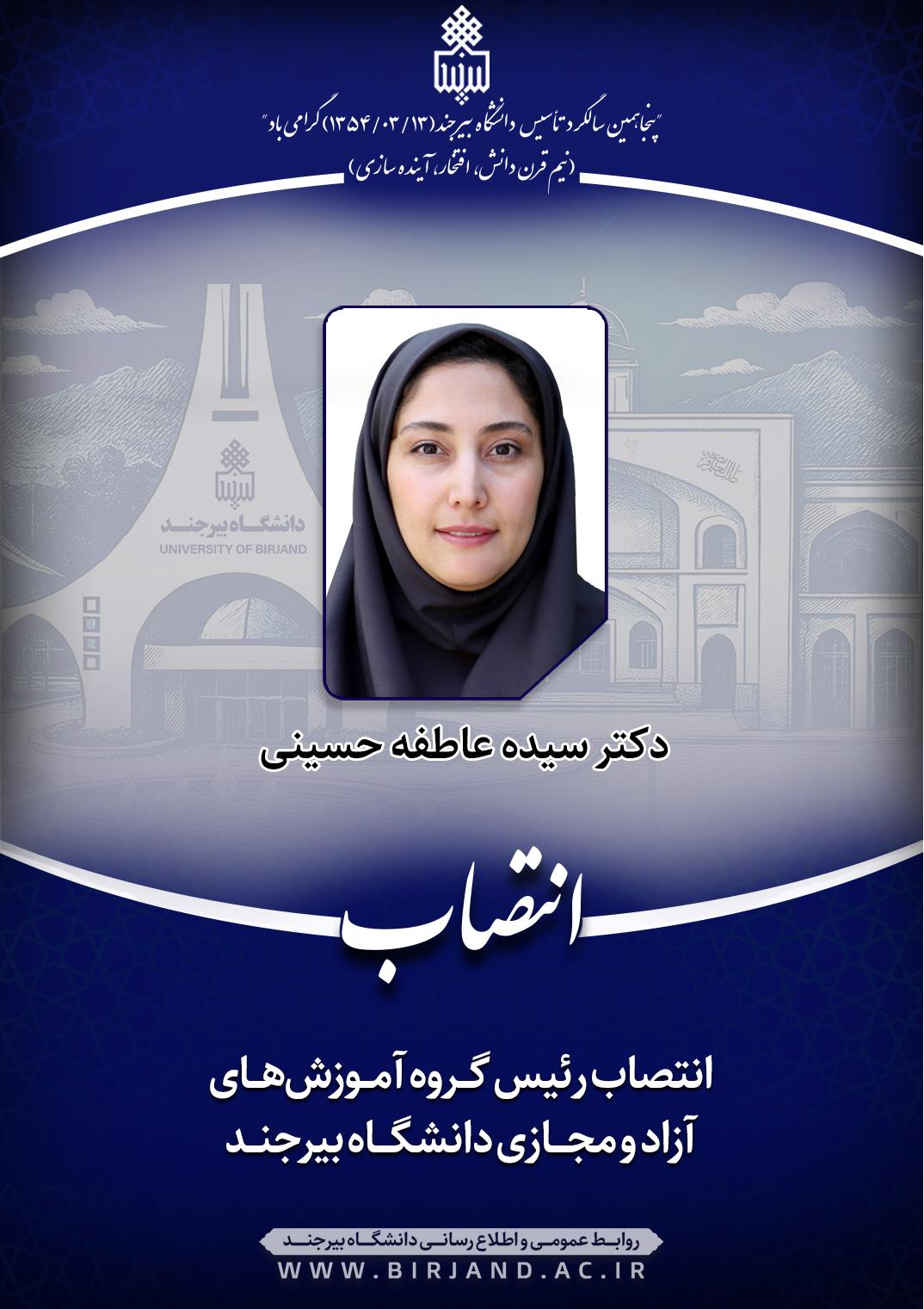 طی ابلاغی، دکتر احمد خامسان، سرپرست دانشگاه بیرجند، دکتر سیده عاطفه حسینی، عضو هیأت علمی گروه آموزشی گیاه پزشکی را به مدت دو سال به عنوان رئیس گروه آموزش‌های آزاد و مجازی دانشگاه منصوب کرد.
