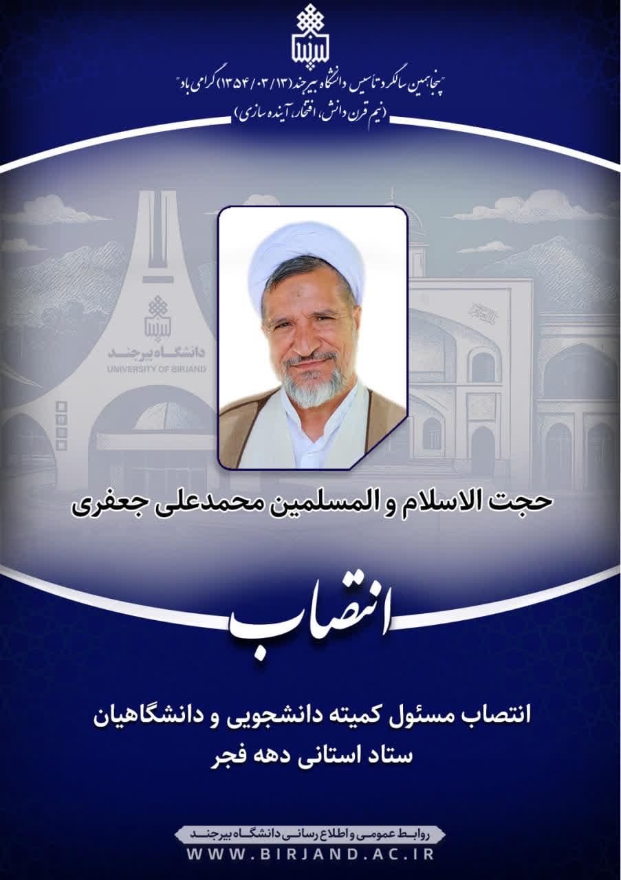 حجت الاسلام محسن مشرفی ، رئیس شورای هماهنگی تبلیغات اسلامی خراسان جنوبی و رئیس ستاد دهه فجر استان، طی ابلاغی، حجت الاسلام و المسلمین محمدعلی جعفری، رئیس دفاتر نهاد نمایندگی مقام معظم رهبری در دانشگاه‌های خراسان جنوبی را به عنوان مسئول کمیته دانشجویی و دانشگاهیان ستاد استانی دهه فجر و چهل وهفتمین سالگرد پیروزی انقلاب اسلامی منصوب کرد.