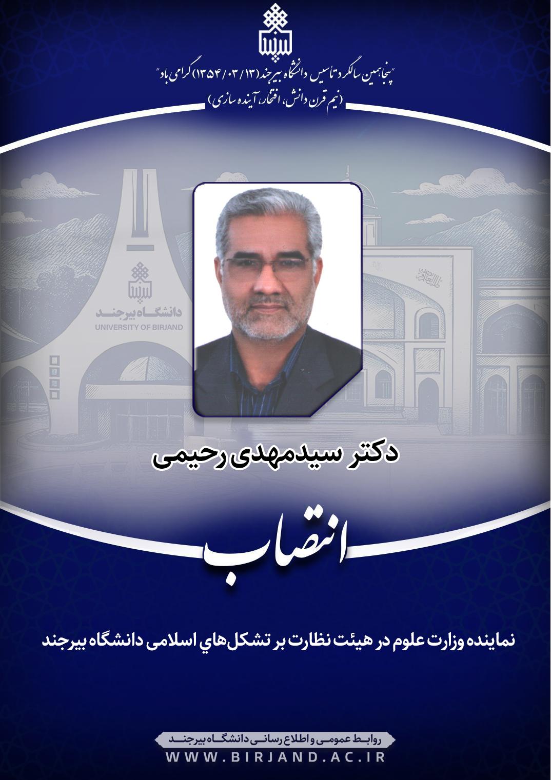 به گزارش روابط عمومی و اطلاع‌رسانی دانشگاه بیرجند، در ابلاغ مقام عالی وزارت علوم به دکتر سیدمهدی رحیمی آمده است؛ نظر به مراتب تعهد و تجارب ارزنده جنابعالی در حوزه آموزش عالی، و به استناد ماده 4 آیین نامۀ تشکل‌های اسلامی دانشگاهیان، و حسب پیشنهاد معاون محترم فرهنگی و اجتماعی برای دو سال به سمت نماینده وزارت علوم در هیئت نظارت بر تشکل‌های اسلامی دانشگاه بیرجند منصوب می‌شوید.